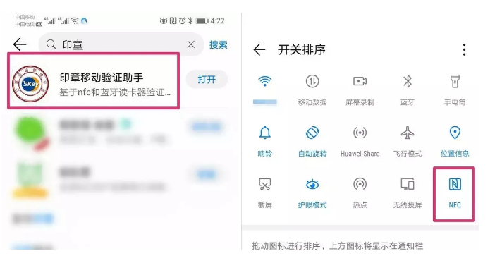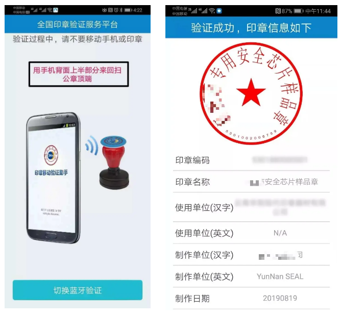 将嵌入专用安全芯片的部位靠近手机识别,手机NFC读取印章芯片后,就会弹出印章备案的信息。