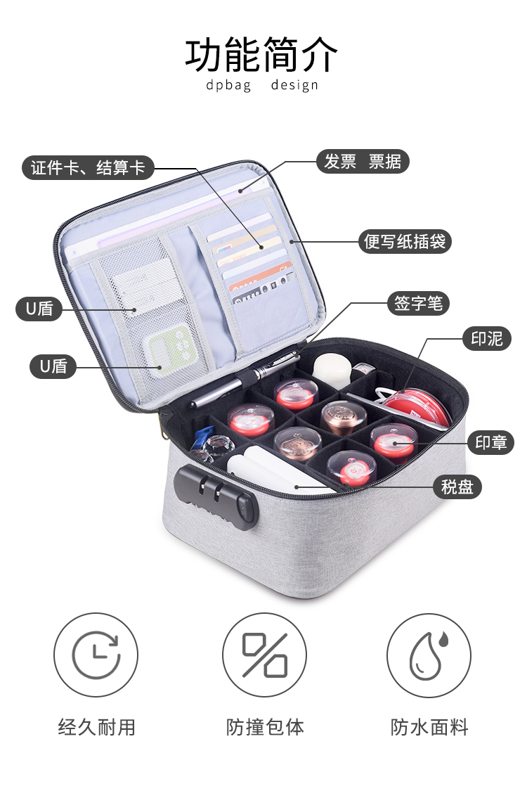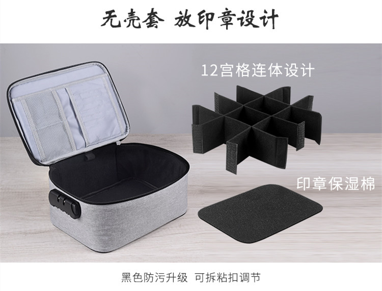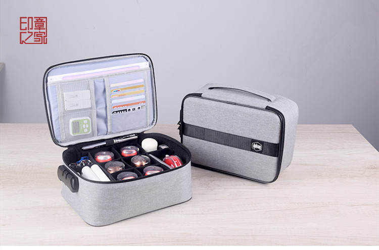 把手上管理的印章一个个放进收纳包里,分门别类存放好,能节省很多空间。每个印章都有自己的专属小格子,下次要使用印章的时候,迅速就能找到。印章收纳包上还带密码锁,等于给印章们加多一重保护。