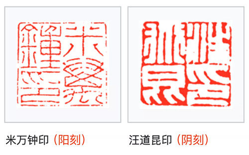 印章的印文分两种,下图左边的是阳刻(印面文字凸起的朱文印),右边的是阴刻(印面文字凹陷的白文印)。
