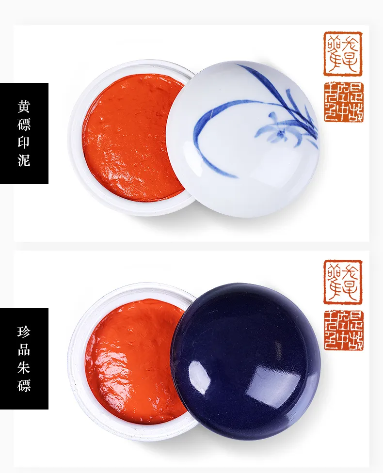 朱砂鲜红,朱磦偏黄。在书画作品上盖印用何种印泥合适,要看书画用纸、内容以及个人喜好。对于厚重的白文印,推荐使用朱磦印泥。因为朱磦印泥堆砌感强烈,且颜色感觉厚重沉着。