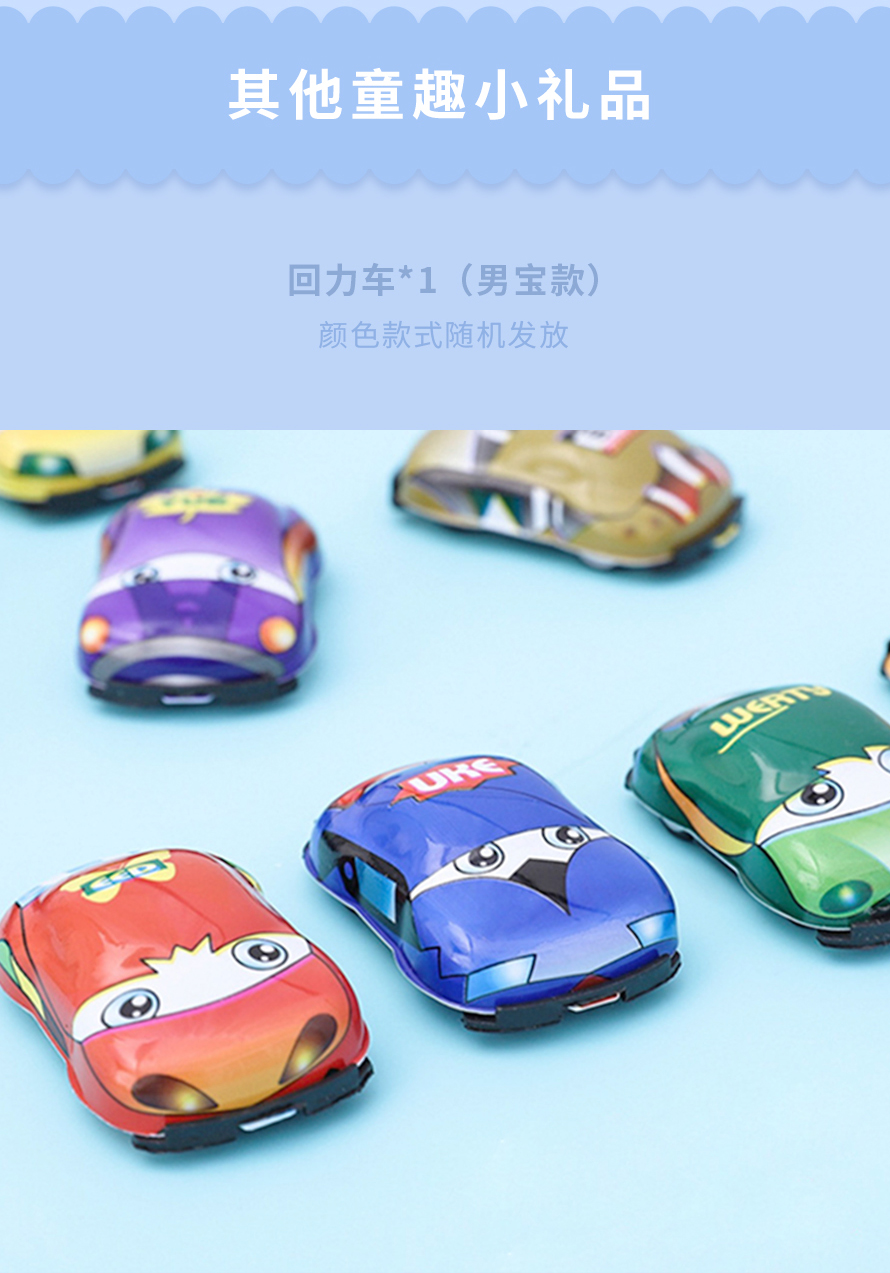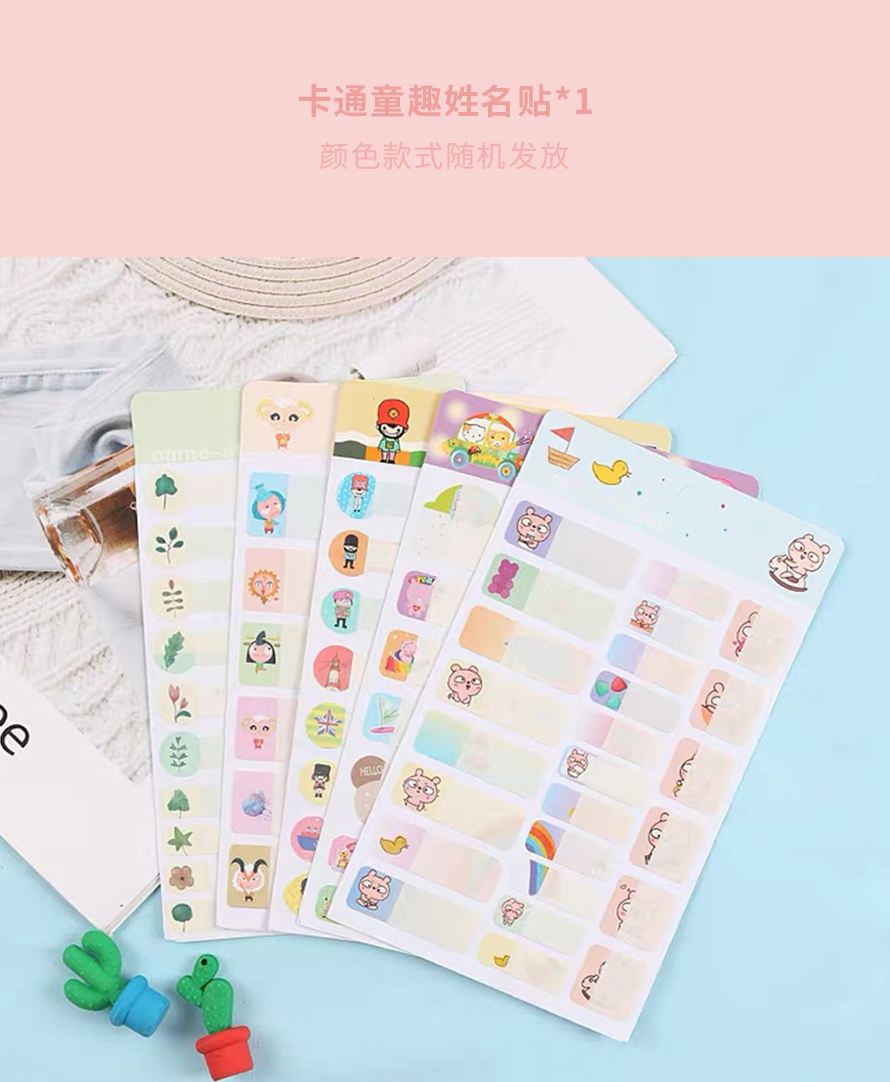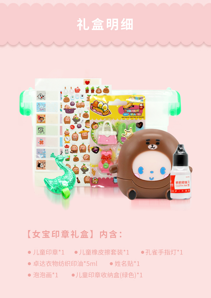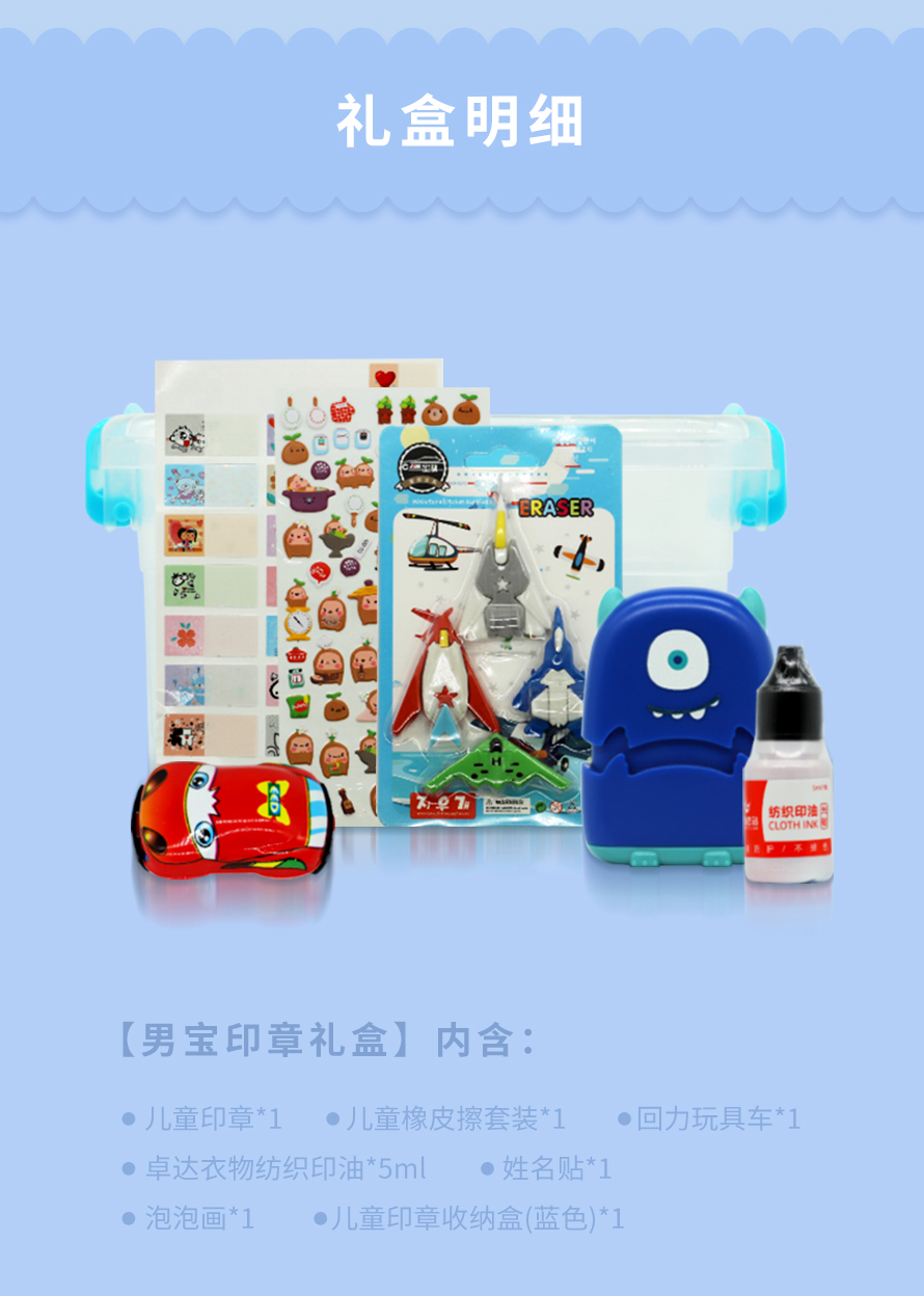 套装里搭配了儿童姓名章、橡皮擦、姓名贴、泡泡画、孔雀手指灯(女宝款)、回力车(男宝款)、收纳盒等等。