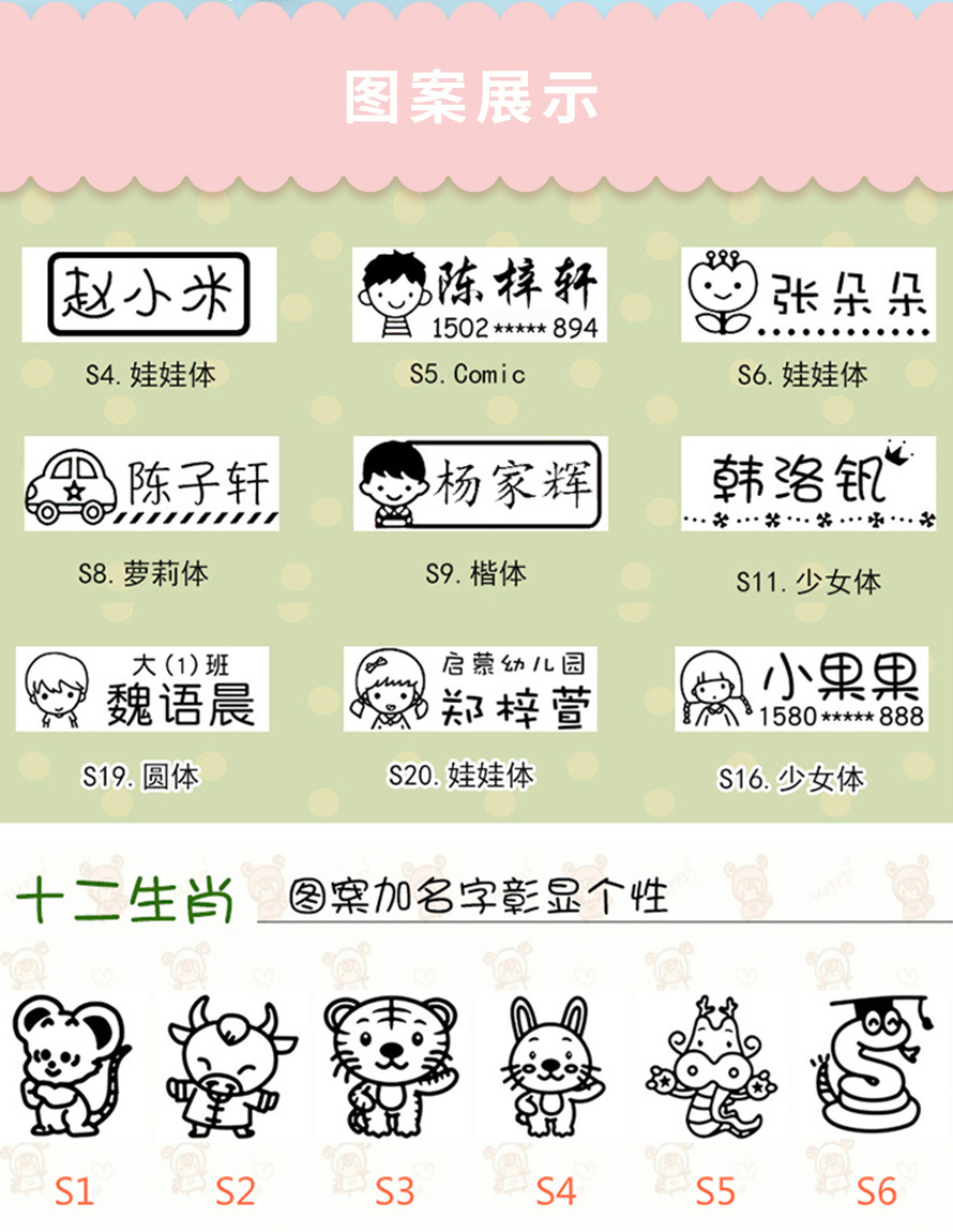以下是部分图案字样,想看更多图案样式,可点击【印章之家平台】儿童印章产品,查看详情哦~
