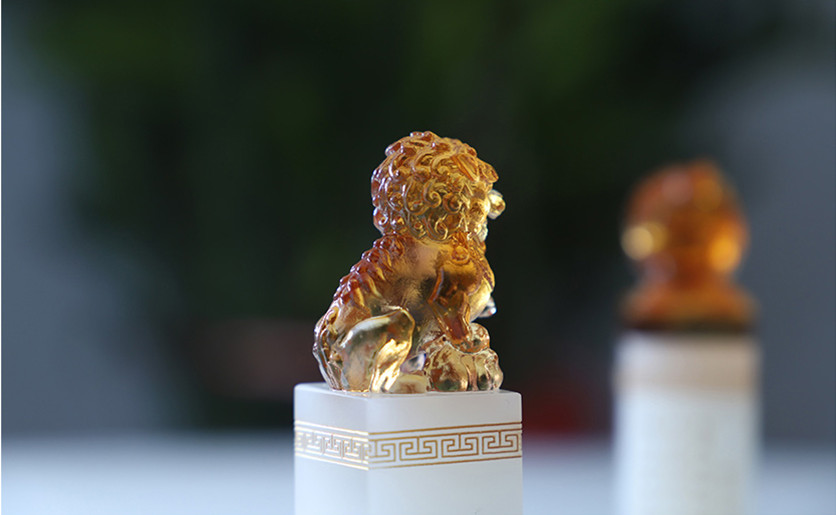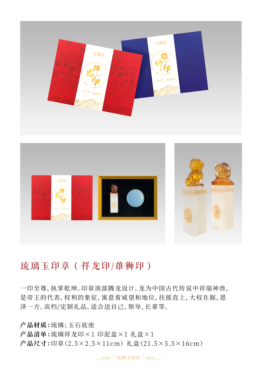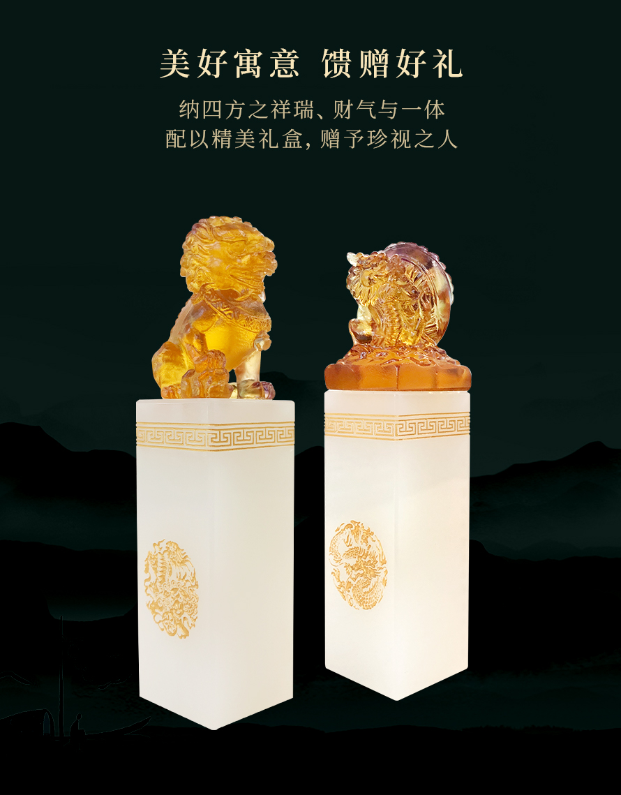 琉璃玉祥龙印/雄狮印,以琉璃打造龙身/狮身,通体透亮,流光溢彩;